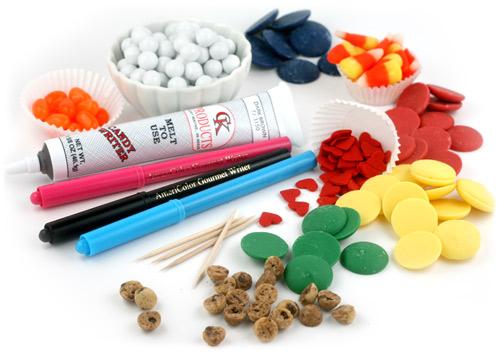 下面是一些你需要的用品:彩色糖果融化紅糖果熔體綠色糖果融化黃色糖果融化巧克力糖果融化深棕色糖果作家派拉蒙晶體食用墨水筆巨型紅色的心灑黃打磨糖迷你巧克力曲奇(Gripz的奇寶) 白色圓形糖果的眼睛 橙果凍豆 糖果玉米 牙籤基本蛋糕POP指令.................