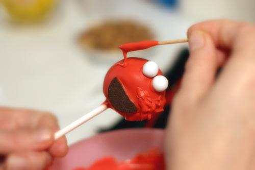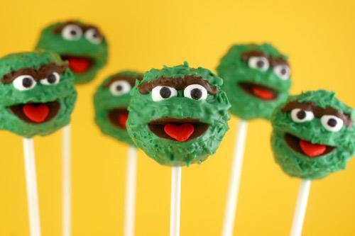 奧斯卡的眼睛是不同於其他人。他的插圖,而不是坐在上方彈出。要實現的外觀,切了一半的糖果片,並將其附加。乾燥時,使用棕色糖果巧克力糖果作家或塗層和管道上的眉毛。他的舌頭是紅色的巨型心撒上點切四捨五入。