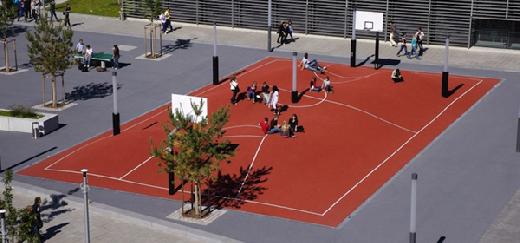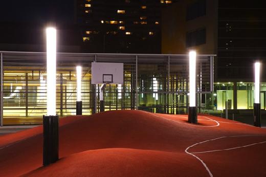 這是由德國藝術團體Inges Idee所設計的一個如沙漠一般高低起伏的籃球場。球場本身的大小與一般球場無異,但有著3D曲面的地面卻連一顆球都無法好好放置。這個籃球場包含了兩個籃球框、柔軟的橘紅色地面,和許多條狀造型的街燈。地面的起伏是經由電腦3D軟體演算得來。如果你正納悶這樣的球場可以用來做什麼,那不妨參考圖片裡的人的做法,躺下來悠哉的曬個太陽吧!