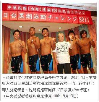 日台運動文化推進協會理事長松本彧彥,今天率領「泳渡台日黑潮」活動的海泳隊隊長鈴木一也、鈴木敦士、石井健太以及還是大學生的清水雅也、山田浩平,在東京的台北駐日經濟文化代表處召開記者會,對國際媒體說明泳渡台日黑潮活動的動機和決心。