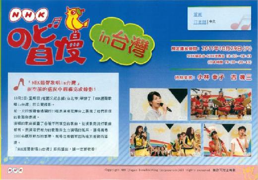 10月2日(星期日)在國父紀念館(台北市)公開錄影OK的「NHK揚聲歌唱in台灣」。 前一天的預選會中過關的25組表演者在舞台上展現了他們自信的歌聲與表演。演唱的歌曲涵蓋了各種不同類型的歌曲,從演歌到流行歌曲都有。表演者們有力的歌聲與全力演唱的風采,獲得滿場2000名觀眾熱烈的掌聲,現場也有觀眾因為過於感動而落淚。