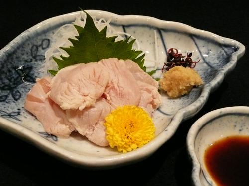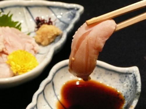 名古屋鬥雞不但是肉質絕佳,料理店家強調的更是「鮮度」,馬上送上來的竟是「鬥雞沙西米」!!記得小時候有教過,雞肉不可以生吃,只是人生就這麼一遭,也就試試吧!雞肉是用雞胸肉的部分,稍微將表面川燙過,裡面還是粉紅色的,夾一塊在燈光下,還真是白裡透紅呢!沾點薑末醬油,清爽甜美,本以為雞胸肉應該會比較乾,缺乏甜味及彈性,但這沙西米把雞肉的優點完全展現出來了.不過也因為這雞肉是早上現宰的,否則還真是吃不到沙西米。