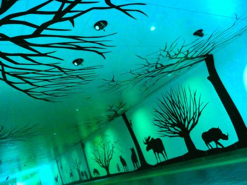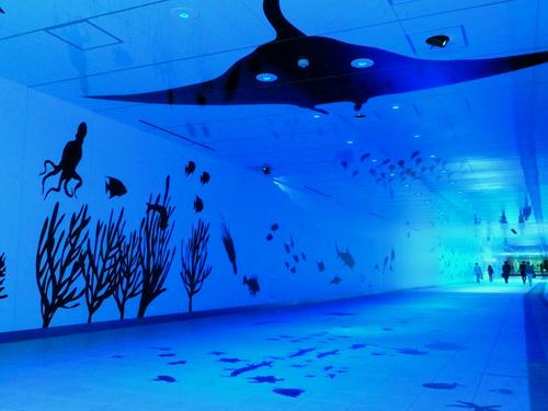 從名古屋車站的地鐵站走地下街可以一路通到「LUCENT TOWER」大樓,那裡是我今晚和朋友約的目的地。一路走著都是再熟悉不過的店家,到地下街時氣氛開始有了明顯變化。LUCENT TOWER大樓是一棟新大樓,與地下街連結的部分也是新的,設計師當時在大樓與地下街放進了許多藝術元素,利用燈光圖案創造出迷幻的感覺。左右牆壁、地上、天花板,從森林到海底世界,燈光的變化活化了圖案,短短的地下街變成了進入異空間的隧道。