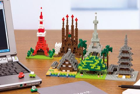 這些迷你系列的共同特色是,作品都很小,大概約莫掌心大小。做好之後擺在桌案上觀賞,賞心悅目之餘,還有出國旅遊(這又跟咱們的 便利商店宣傳語很像)欣賞風景的氣氛。也因為材料細小,材料包一盒裝起來也沒多大,買的時候沒有扛積木回家的感覺,反倒比較像是買一小包糖果餅乾似的,輕巧無負擔,也因而更受女性歡迎。