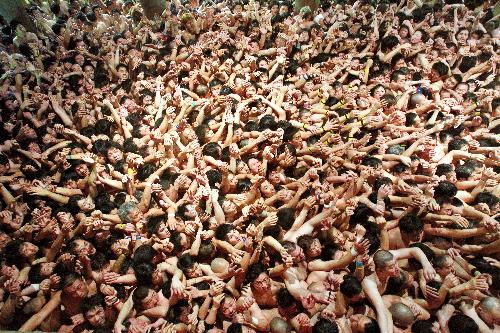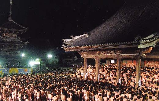 「三大奇祭」之一,亦被稱之為「會陽/えよう」,在日本岡山縣的西大寺舉行的「裸祭/はだかまつり」由來已久,最早從奈良時代開始。在裸祭時,數千名接近萬名的男子,裸露身體只穿著日式傳統丁字褲(ふんどし)以及日式傳統襪套(足袋/たび),在嚴寒的深夜裡沿襲傳統搶奪兩塊「寶木」,這個活動也吸引了外國觀光客參加喔。別以為在寒冬時舉辦這個活動很冷吱吱,看到現場大家都擠爆要搶寶木的景象,整個熱血沸騰,感受不到冷呀。搶到寶木的那組男子們,則可受封為「福男」,那當然就是會受神明保佑,闔家平安,生意興隆,五穀繁盛啦。裸祭原則上是只有男生可以參加的,另外也有專為小學在學的小男生舉辦的「少年裸祭」。