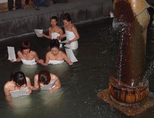 那女生呢?在晚間七點可在「垢離取場」池子中繞場一圈,當然就是要消災解厄並且祈福。之後的活動開場的「會陽太鼓」也是由女生擔綱演出,然後正式進入裸祭活動的開始。