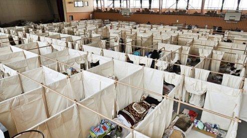 在學校中的臨時避難所,每個家庭有同樣的大小的空間,且有布簾遮避,彼此尊重