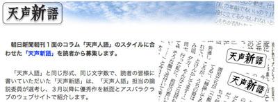 朝日新聞的「天声人語」是大家都知道很有名,但是大家可能就不知道「天声新語」,什麼是「天声新語」?「天声新語」是朝日新聞的新活動,仿照「天声新語」的樣本,就是將想法用600字表現出來,這次是『挑戰』做題目的徵文比賽,6歲到90歲中間都有人寄作品來共有656個人,得優勝獎的或佳作者都會被刊登到報紙,大家也可試試看。