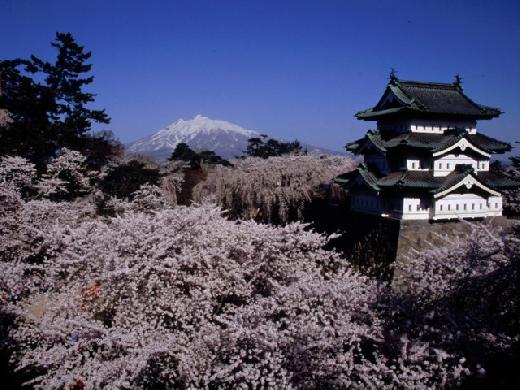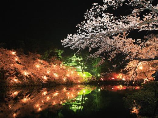 初次築城是在西元1611年的弘前城,目前現存的天守是在西元1810年重建而成,並且保存至今,城區範圍被規劃成弘前公園。公園內種植約50種、2600株的櫻花,當夜晚的燈光亮起,將櫻花滿開的盛況轉為另一種樣貌。
