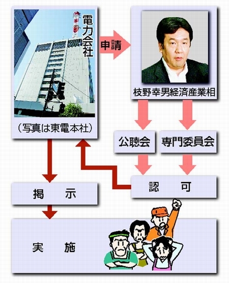 因為去年 311 東日本大地震所引發的海嘯、核電危機,導引出一連串的核安與用電問題。雖說漲價是不得不為,但無法充分供電還要漲價,對使用者來說,用電用得不安心,還得付出更高代價,真的會很不是滋味吧。經產省同意東電的漲價方案,卻也不得不說幾句重話。畢竟獨佔產業還漲價,讓人無所選擇只能任憑宰割,怎樣說都很難服眾(這一點跟咱們台電很像),因此經產省要求東電要改革經營方式,也的確在審查東電的申請案時,經過一再地查核,刪減掉一些人事費與福利費用,才能將漲價幅度縮小了一些。