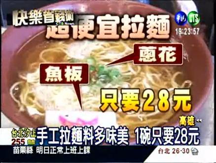 快樂省錢術,今天帶您來品嘗超便宜的拉麵,高雄市有拉麵業者推出一碗只要28元的拉麵,使用的麵條不但是每天手工製作,連湯頭都是熬煮8個小時的特製大骨湯,由於湯頭好,一天賣超過100碗,還有豬肉蓋飯也只要38元,每到吃飯時間就吸引不少民眾來搶便宜。