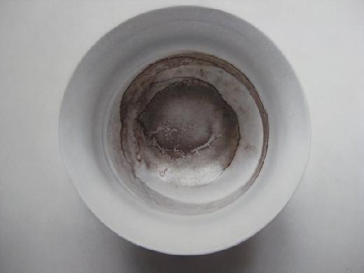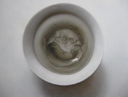 距離上一次看到朱昱的架上作品,已經是時隔三年的時間了。在2007年的夏天,《剩餐》系列的展出,無疑讓這位極具爭議的當代藝術家以一種全新的方式亮相和回歸到觀眾的視野中:冷靜的畫幅,一個個只剩下殘羹冷炙的白色餐盤雖說無聲,但卻以一種非凡的氣質和難以表述的禪意引發了觀者的無限遐想。剩餘的食物帶來了豐富的視覺效果,但這些支離破碎的色彩繽紛,卻有一種無以名狀的悲情感。在當時的文字中,藝術家試圖將宋元文人繪畫的空靈和靜謐與西方照相寫實的逼真結合到一起,但在我眼中,那些視覺所糾葛的寧靜與無聲的史詩般的效果,依然記憶猶新。和《剩餐》相比,《茶漬》的灰色調,少了《剩餐》的豐富和嘈雜,反而將時間和記憶的影子更加真實地曝露在我的視野中。在中國當代藝術中,視覺語言的選擇和把握,很多時候決定了一個藝術家的風格與作品的脈絡,朱昱的選擇將它的系列作品勾勒成了相對完整的線索,對殘存記憶的記錄和表達,從《剩餐》到《茶漬》,不但在色彩方面產生了更加對純粹和簡化的追求,也將食物所承載的事物的存在與經歷完整鋪陳開來。