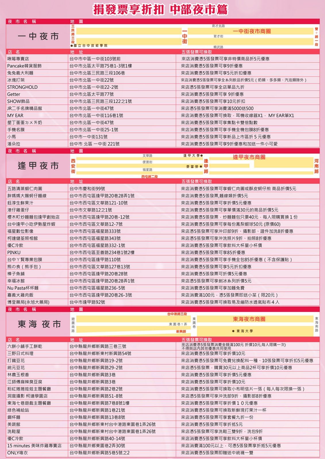 消費者到全國14個夜市可使用5張發票享有優惠折扣,配合「愛心灶腳」活動,發票將全數捐給創世基金會、人安基金會,希望藉由逛夜市的人潮來收集發票,大家共同幫助街友、弱勢朋友及更多需要幫助的人。
