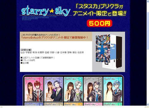 アニメイトの公式サイトにて、人気乙女コンテンツ「starry☆sky」のプリクラが店舗限定で設置されることが告知されている。