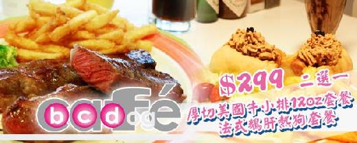 今日: 《食尚奧斯卡獎入選美食》$299超殺美食 bcdog cafe 主廚厚切美國牛小排12oz套餐 或 法式鵝肝熱狗套餐 (含服務費)