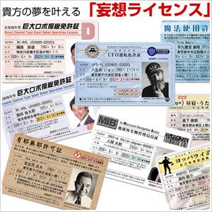 “妄想許可証”共有8種,包括“巨型 機器人操作許可証(直接操縱型)”、“巨型 機器人操作許可証(間接操縱型)”、“UFO駕照”、“魔法使用許可証”、“午睡許可証”、“外星生物管理局工作証”……等等。該証件上印有自己的姓名、照片、住址等詳細資料,大小與日本駕照一樣,使用0.8mm厚高質卡片精心印制而成。看起來有模有樣,在公司拿出來展示一定凡響強烈。