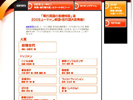 12月1日,“2009年流行語大獎”發表了。大獎的桂冠被“政權交替”奪取。“僅僅4個字的直接號召,獲得了國民們絕對的支持”,這對於鳩山 首相來說,的確是件感激之事,不過,也因為受此意義重大的期待,說不定肩頭沉甸甸的呢。透過該用語的獲獎,看來,今後不僅在政治上,一般的公司、家庭,今後也將突入一個“感到快要發生政權交替”的時代了。