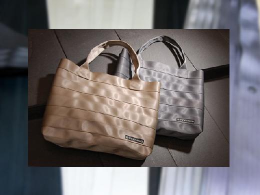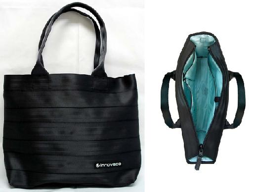 而另一個環保包品牌innoveco,利用廢棄汽車安全帶做材料,針對男性而設計。日本的廢車分解回收率雖已超過90%,電視上也介紹過利用廢輪胎設計新款包包,但不起眼的安全帶卻無人回收,只能丟棄。安全帶因其特殊用途,制作時使用極其強韌的編織法,十分耐磨損。顏色以暗色調為主,每條又都多少帶些色差。獨具慧眼的設計師,將回收來的上百種安全帶按顏色深淺不同,巧妙拼接。縫制成的包包結實耐用、外觀時尚又不失穩重感。