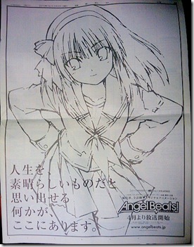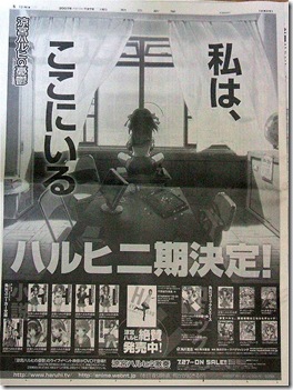 繼之前的涼宮春日二期在朝日新聞跟今年的春番Angle Beats!在読売新聞都登上全版廣告之後(聽說票房賣的很好的鋼彈00也有但是我找不到全版廣告圖),很開心的這次換禁書二期跟我妹聯手登上了以經濟新聞為主的日經新聞全頁廣告! 『立ち上がれ日本経済』再加上這句話,其實整個暗藏的意義就很耐人尋味了。
