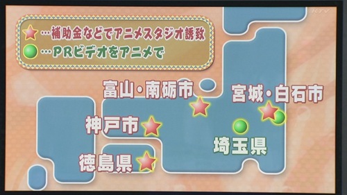 紅星代表發放補助金引誘動畫到當地進行活動、綠色則是宣傳影片是使用動畫製作的