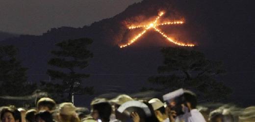 在日本京都市舉行的五山送火儀式,圖中是儀式中在山上點燃“大”字形篝火,相傳,在這天晚上把大文字的火光倒映到酒杯或水盆裏,飲下裏麵的酒或水,可以免生疾病,而且,燒剩下的炭還可以去災避邪。