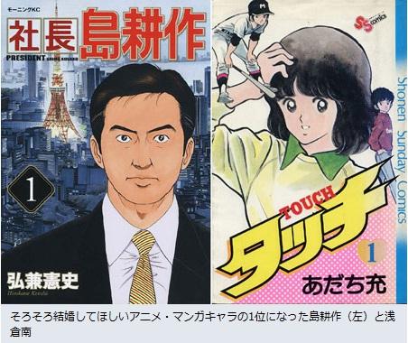 56票を集めてトップに立ったバツイチの島耕作について、「もう一度結婚にトライ!」「社長になったことだし、そろそろ結婚してもいいのでは」などと再婚を応援する声が寄せられた。島を上回る最多の63票を集めた浅倉南は、「いい奥さんになりそう!」「南ちゃんならステキな人をたくさんご紹介できますよ」などの回答が寄せられた。