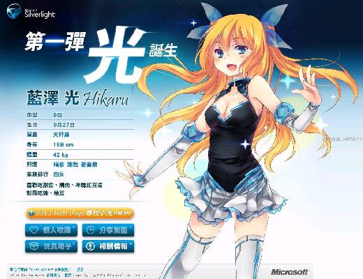 台灣微軟公司為了推廣銀光(SliverLight)技術大改版,特別製作了一個漫畫美少女藍澤 光(Hikaru)當代言人,推出當日就震動日本,台灣