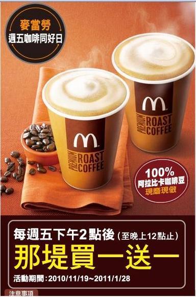 看好540萬咖啡族的消費市場 麥當勞11月19日至明年1月28日推出「咖啡同好日」 期間每周五14:00~24:00「那堤咖啡買一送一」 冬日下午的咖啡金是有賺到窩!
